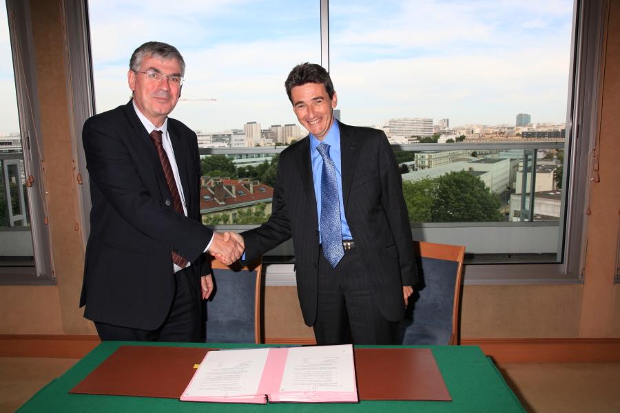 Dans le cadre du Salon du Bourget 2009, M. Philippe de Fontaine Vive, vice-président de la Banque Européenne d’Investissement (BEI), et M. Jean-Paul Herteman, Président du directoire de SAFRAN, ont signé un contrat de financement de 300 millions d’euros au groupe SAFRAN pour le développement d’une nouvelle génération de moteurs d’avions plus propres.