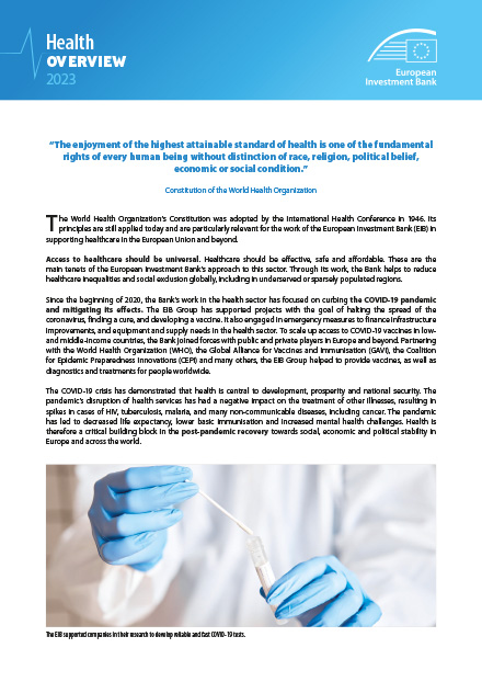Diese Veröffentlichung gibt einen Überblick darüber, wie die Europäische Investitionsbank Gesundheit fördert. Sie informiert über die Aktivitäten und die wichtigsten Projekte der Bank in diesem Bereich. Die Storys, Videos und Fallstudien veranschaulichen, wie die Bank Ländern, Regionen und Städten mit Finanzierungen und Beratung zur Seite steht.