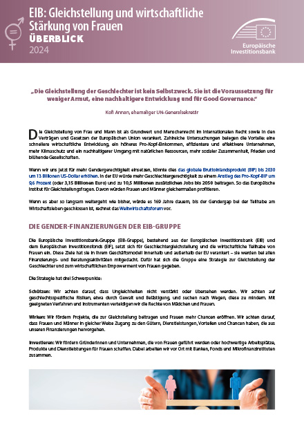 Diese Veröffentlichung gibt einen Überblick über die Arbeit der Europäischen Investitionsbank im Bereich der Gleichstellung und wirtschaftliche Stärkung von Frauen. Sie informiert über die Aktivitäten und die wichtigsten Projekte der Bank in diesem Bereich. Die Storys, Videos und Fallstudien veranschaulichen, wie die Bank Ländern, Regionen und Städten mit Finanzierungen und Beratung zur Seite steht.