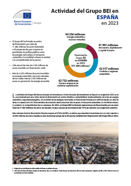 La actividad del Grupo BEI (Banco Europeo de Inversiones y Fondo Europeo de Inversiones) en España en el ejercicio 2023 se ha caracterizado por unas cifras récord de financiación en acción climática y sostenibilidad medioambiental, así como en energía sostenible y seguridad energética. En el ámbito de las energías renovables, la financiación firmada por el BEI en España en 2023 se sitúa a la cabeza de la UE. Otros ámbitos de actuación destacados han sido el apoyo al transporte sostenible y la movilidad urbana, la sanidad y la competitividad de las empresas. En 2023, el Grupo BEI ha firmado operaciones de financiación por un valor total de 11 386 millones EUR en España, lo que supone un incremento del 14 % en relación con el ejercicio anterior.