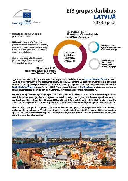 Eiropas Investīciju bankas grupa, kurā ietilpst Eiropas Investīciju banka (EIB) un Eiropas Investīciju fonds (EIF), 2023. gadā projektiem Latvijā sniedza finansējumu 82 miljonu EUR apmērā. Lai atbalstītu 5G tehnoloģijas ieviešanu visā valstī, banka parakstīja finansēšanas līgumu ar interneta pakalpojumu sniedzēju un mobilo sakaru operatoru Latvijas Mobilais Telefons, kas pazīstams kā LMT. EIB arī parakstīja līgumu ar Luminor Bank, lai atvieglotu aizdevumu izsniegšanu mazajiem uzņēmumiem, īpašu uzmanību pievēršot zaļās pārkārtošanās atbalstam.