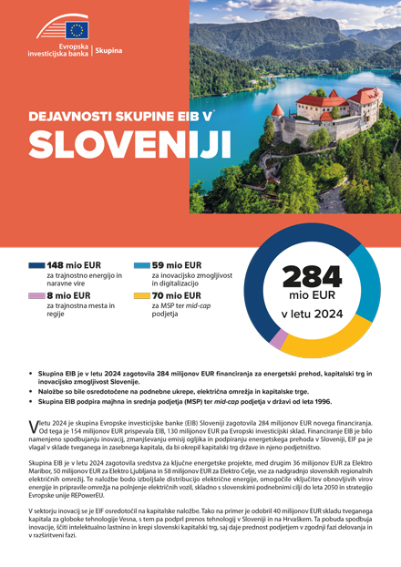 Vletu 2024 je skupina Evropske investicijske banke (EIB) Sloveniji zagotovila 284 milijonov EUR novega financiranja. Od tega je 154 milijonov EUR prispevala EIB, 130 milijonov EUR pa Evropski investicijski sklad. Financiranje EIB je bilo namenjeno spodbujanju inovacij, zmanjševanju emisij ogljika in podpiranju energetskega prehoda v Sloveniji, EIF pa je vlagal v sklade tveganega in zasebnega kapitala, da bi okrepil kapitalski trg države in njeno podjetništvo