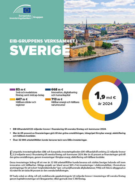 Europeiska investeringsbanken (EIB) och Europeiska investeringsfonden (EIF) tillhandahöll omkring 22 miljarder kronor (1,9 miljarder euro) i finansiering till svenska företag och kommuner 2024. Mer än 65 procent av finansieringen gick till den gröna omställningen, genom investeringar i förnybar energi, elektrifiering och hållbara bostäder.