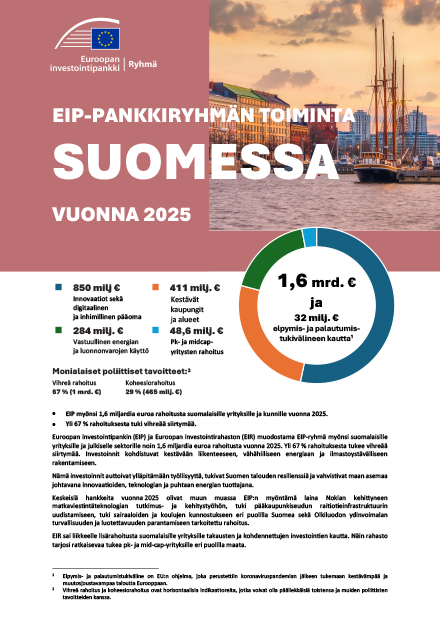 Euroopan investointipankin (EIP) ja Euroopan investointirahaston (EIR) muodostama EIP-ryhmä myönsi suomalaisille yrityksille ja julkiselle sektorille noin 1,6 miljardia euroa rahoitusta vuonna 2025. Yli 67 % rahoituksesta tukee vihreää siirtymää. Investoinnit kohdistuvat kestävään liikenteeseen, vähähiiliseen energiaan ja ilmastoystävälliseen rakentamiseen.