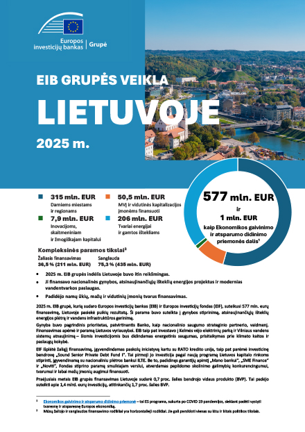 2025 m. EIB grupė, kurią sudaro Europos investicijų bankas (EIB) ir Europos investicijų fondas (EIF), suteikusi 577 mln. eurų finansavimą, Lietuvoje pasiekė puikių rezultatų. Ši parama buvo sutelkta į gynybos stiprinimą, atsinaujinančiųjų išteklių energijos plėtrą ir vandens infrastruktūros gerinimą.