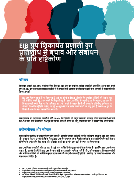 अपना कार्य करते समय, EIB-CM का सामना उन शिकायतकर्ताओं से हो सकता है जो प्रतिशोध के जोखिम से डरते हैं या जो पहले से ही प्रतिशोध के अधीन रहे हों। EIB- CM शिकायतकर्ताओं या शिकायत से संबंधित लोगों के खिलाफ प्रतिशोध के संभावित जोखिमों को रोकने और संबोधित करने के लिए कदम उठाने के लिए प्रतिबद्ध है। EIB-CM नीति के अनुच्छेद 2.6 के अनुसार, EIB-CM के शिकायतकर्ताओं को शिकायत करने के अपने अधिकार का प्रयोग करने के कारण किसी भी प्रकार के प्रतिशोध, दुर्व्यवहार या किसी भी प्रकार के भेदभाव के अधीन नहीं होना चाहिए। यह पूरे EIB ग्रुप और उन प्रतिपक्ष पर लागू होता है जो EIB ग्रुप के किसी भी हिस्से के साथ व्यावसायिक संबंध में जुड़े है। इस दस्तावेज़ का उद्देश्य उन प्रयासों के प्रति EIB-CM के दृष्टिकोण को प्रस्तुत करना है।