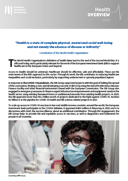 Diese Veröffentlichung gibt einen Überblick über die Arbeit der Europäischen Investitionsbank-Gruppe in den Bereichen Gesundheit und Life Sciences. Sie informiert über die Aktivitäten, Partnerschaften und wichtigsten Projekte der EIB-Gruppe in diesen Sektoren. Die Storys, Videos und Projektbeispiele veranschaulichen, wie die EIB-Gruppe mit ihren Krediten und ihrer Beratung zur Verbesserung der öffentlichen Gesundheit beiträgt – sei es zum Bau und zur Modernisierung von Krankenhäusern oder zur Erforschung und Entwicklung von Impfstoffen und medizinischen Behandlungsmethoden.