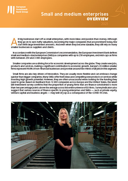 Diese Veröffentlichung gibt einen Überblick darüber, wie die Europäische Investitionsbank kleine und mittlere Unternehmen unterstützt. Sie informiert über die Aktivitäten und die wichtigsten Projekte der Bank in diesem Wirtschaftssegment. Die Storys, Videos und Fallstudien veranschaulichen, wie die Bank Ländern, Regionen und Städten mit Finanzierungen und Beratung zur Seite steht.