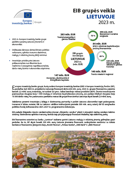 Europos investicijų banko grupė, kurią sudaro Europos investicijų bankas (EIB) ir Europos investicijų fondas (EIF), paskelbė, kad 2023 m. projektams Lietuvoje finansuoti skirta 654 mln. eurų. 2023 m. grupės finansavimu paremta beveik 2,3 mlrd. eurų investicijų, tai sudarė 0,9 proc. šalies bendrojo vidaus produkto (BVP). Šiomis investicijomis pasinaudojo daugiau kaip 1 000 mažųjų ir vidutinės kapitalizacijos įmonių, jos padėjo išlaikyti daugiau kaip 15 500 darbo vietų. Per pastaruosius penkerius metus EIB grupė finansavimui Lietuvoje skyrė beveik 2,4 mlrd. eurų.