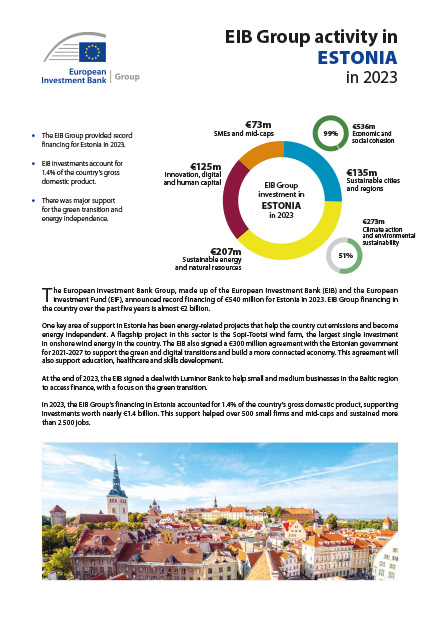 In 2023, the European Investment Bank Group (EIB Group), which encompasses the European Investment Bank and the European Investment Fund, significantly bolstered Estonia's economy with a record €540 million in financing. The investments focused on the green transition, namely Estonia's largest offshore wind farm, digital infrastructure and support for small and medium businesses.