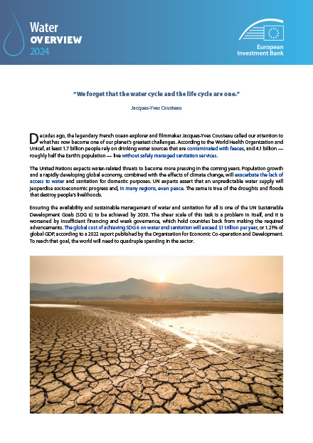 This publication gives an overview of the European Investment Bank’s contribution for water management. It details the Bank’s activities in the sector and highlights key projects. The stories, videos and case studies, illustrate how the Bank’s financing and advice help countries, regions and cities.