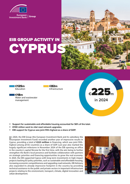 In 2024, the EIB Group (the European Investment Bank and its subsidiary the European Investment Fund) recorded another year of impressive results in Cyprus, providing a total of €225 million in financing, which was joint fifth-highest among all EU countries as a share of GDP. Last year also marked the hugely significant milestone in November 2024 of the EIB opening an office in the country’s capital Nicosia for the first time, with the aim being to further strengthen the Bank’s local presence and facilitate collaboration with partners on strategic priorities and financing opportunities to grow the real economy.
