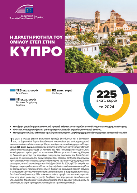 Tο 2024, ο Όμιλος ΕΤΕπ (η Ευρωπαϊκή Τράπεζα Επενδύσεων και η θυγατρική της, το Ευρωπαϊκό Ταμείο Επενδύσεων) παρουσίασε για ακόμη μία χρονιά εντυπωσιακά αποτελέσματα στην Κύπρο, παρέχοντας συνολική χρηματοδότηση ύψους 225 εκατ. ευρώ, η οποία ήταν η πέμπτη υψηλότερη κοινή χρηματοδότηση μεταξύ όλων των χωρών της ΕΕ ως ποσοστό του ΑΕΠ. Το περασμένο έτος (ή το 2024) λειτούργησε για πρώτη φορά το γραφείο της ΕΤΕπ στην πρωτεύουσα της Κύπρου, τη Λευκωσία, με στόχο την περαιτέρω ενίσχυση της παρουσίας της Τράπεζας στη χώρα και τη διευκόλυνση της συνεργασίας με τους εταίρους σε θέματα στρατηγικών προτεραιοτήτων και ευκαιριών χρηματοδότησης για την ανάπτυξη της πραγματικής οικονομίας, αποτέλεσε ορόσημο τον Νοέμβριο 2024. Το 2024, η ΕΤΕπ στήριξε την Κύπρο με μακροπρόθεσμες επενδύσεις σε έργα υψηλού αντικτύπου που υποστηρίζουν τις προτεραιότητες πολιτικής της ΕΕ, όπως η βιώσιμη και οικονομικά προσιτή στέγαση, η ενίσχυση της ανταγωνιστικότητας της οικονομίας και η αναβάθμιση των οδικών δικτύων. Οι σύμβουλοι της ΕΤΕπ επέκτειναν επίσης την ήδη εντυπωσιακή παρουσία τους στη χώρα μέσω της τεχνικής βοήθειας που παρείχαν σε σπουδαία έργα υποδομών του δημόσιου και του ιδιωτικού τομέα τα οποία αφορούν το περιβάλλον, τις μεταφορές, το κλίμα, την ψηφιακή καινοτομία και την αστική ανάπτυξη.