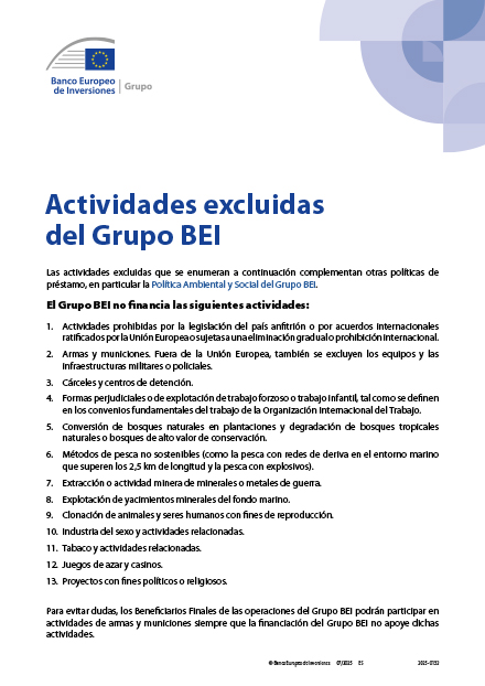 El Grupo BEI dispone de una lista de actividades excluidas para garantizar que la financiación que ofrece se ajusta a sus normas medioambientales, sociales y éticas. Esta lista complementa otras políticas de préstamo, en particular la Política Ambiental y Social del Grupo BEI.