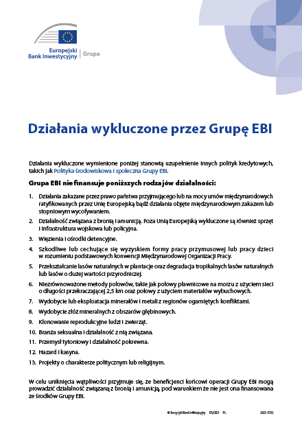Grupa EBI prowadzi wykaz wykluczonych rodzajów działalności, aby zapewnić zgodność finansowanych przedsięwzięć ze swoimi normami środowiskowymi, społecznymi i etycznymi. Wykaz ten stanowi uzupełnienie innych polityk kredytowych, w tym Polityki środowiskowej i społecznej Grupy EBI.