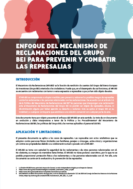 Puede que, en el desempeño de sus funciones, el MR-BEI se encuentre con reclamantes con temor a verse expuestos a represalias o que ya han sido objeto de estas. El MR-BEI se compromete a adoptar medidas para prevenir y subsanar los posibles riesgos de represalias contra los reclamantes o las personas relacionadas con las reclamaciones. De acuerdo con el artículo 2.6 de la Política del Mecanismo de Reclamaciones del BEI, las personas que interpongan una reclamación recurriendo al Mecanismo de Reclamaciones del Grupo BEI no podrán ser objeto de represalias, reproches ni discriminación alguna por haber ejercido su derecho a reclamar. Esto se aplica al Grupo BEI en su totalidad y a cualquier contraparte que establezca una relación comercial con cualquier parte de este. Este documento tiene por objeto presentar en enfoque del MR-BEI en este sentido.
