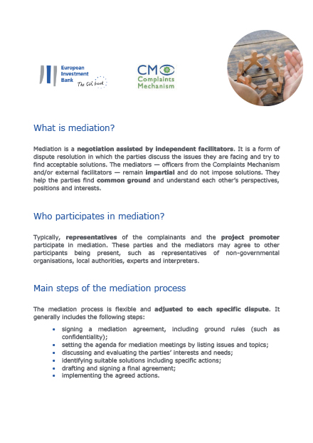 Mediation is a form of dispute resolution in which the parties are invited to get together, talk about their concerns and develop forward-looking solutions with the help of independent facilitators. The mediators — officers from the Complaints Mechanism and/or external facilitators — remain impartial and do not impose solutions. They help the parties find common ground and understand each other’s perspectives, positions and interests.