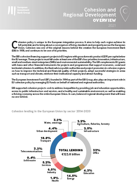 This publication gives an overview of the European Investment Bank’s contribution for cohesion and regional development. It details the Bank’s activities in the sector and highlights key projects. The stories, videos and case studies, illustrate how the Bank’s financing and advice help countries, regions and cities.