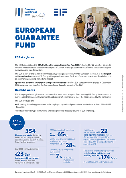 The EGF is part of the €540 billion EU recovery package agreed in 2020 by European leaders. It is the largest crisis mechanism that the EIB Group – European Investment Bank and European Investment Fund - has put on the market, enabling immediate impact.