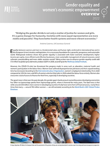 This publication gives an overview of the European Investment Bank’s support for gender equality and women’s economic empowerment. It details the Bank’s activities in the sector and highlights key projects. The stories, videos and case studies, illustrate how the Bank’s financing and advice help countries, regions and cities.