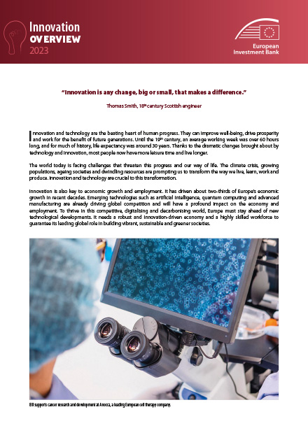 The climate crisis, growing populations, ageing societies and dwindling resources are prompting us to transform the way we live, learn, work and produce. Innovation and technology are crucial to this transformation. Innovation is also key to economic growth and employment. It has spurred about two-thirds of Europe’s economic growth in recent decades. Emerging technologies such as artificial intelligence, quantum computing and advanced manufacturing will have a profound impact on the economy and employment. This publication gives an overview of the European Investment Bank’s contribution in the area of innovation. The stories, videos and case studies illustrate how the Bank’s financing and advice support countries, regions and cities.