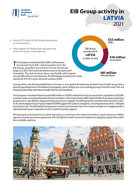 The European Investment Bank (EIB) and European Investment Fund (EIF), which together form the EIB Group, provided around €112 million to Latvian projects in 2021, from national infrastructure to education and innovation. The main business driver was the EIB, which signed close to €98 million in new financing. The EIB Group’s investment in Latvia equalled 0.35% of its gross domestic product (GDP).