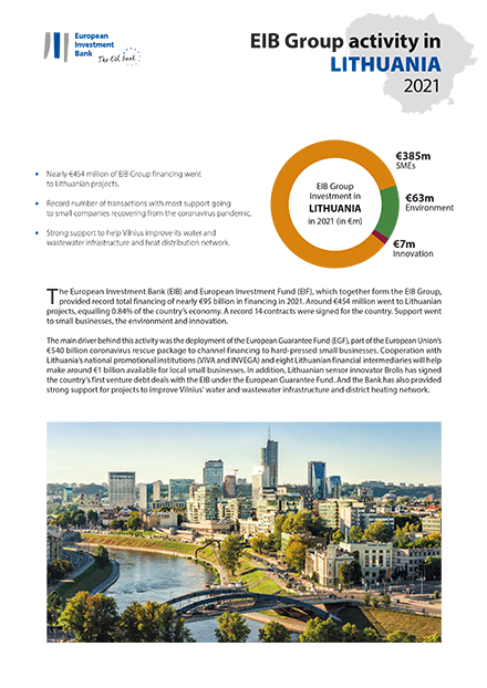 2021 m. Europos investicijų bankas (EIB) ir Europos investicijų fondas (EIF), kartu sudarantys EIB grupę, skyrė rekordinį beveik 95 mlrd. eurų finansavimą. Projektams Lietuvoje skirta maždaug 454 mln. EUR, tai sudaro 0,84 % šalies ekonomikos. Šalyje pasirašyta rekordiškai daug – 14 – sutarčių. Parama skirta mažosioms įmonėms, aplinkai ir inovacijoms.