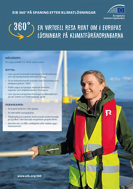 EIB 360° På spaning efter klimatlösningar är en interaktiv, gratis plattform på EIB:s webbplats där besökarna kan göra en resa till banbrytande projekt som gör skillnad i kampen mot klimatförändringarna i Europa. Dessa korta videofilmer har spelats in med toppmoderna 360-graderskameror i några av Europas mest häpnadsväckande miljöer och presenteras av EIB:s reporter, som intervjuar ledande forskare, ingenjörer och experter på plats.