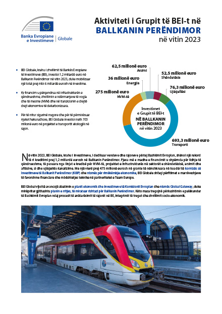 Në vitin 2023, BEI Globale, krahu i investimeve, i dedikuar vendeve dhe rajoneve përtej Bashkimit Evropian, shënoi një rekord të ri kreditimi prej 1,2 miliardë eurosh në Ballkanin Perëndimor. Pjesa më e madhe e financimit u shpërnda për lidhje të qëndrueshme, të pasuara nga linjat e kredisë për NVM-të, projektet e infrastrukturës në sektorët e shëndetësisë, arsimit dhe aftësive, si dhe ujësjellës-kanalizime. Me një vlerë prej 475 milionë eurosh në grante të nënshkruara në kuadër të kornizës së investimeve të Ballkanit Perëndimor (KIBP) dhe nismës për rimëkëmbje ekonomike, BEI Globale shfaqi përfitimet e marrëveshjeve të favorshme financiare dhe mbështetjes teknike në partneritetet e Team Europe.