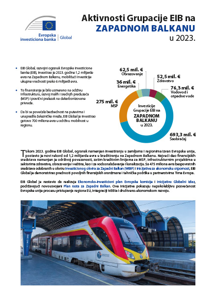 Tokom 2023. godine EIB Global, ogranak namenjen investiranju u zemljama i regionima izvan Evropske unije, postavio je novi rekord od 1,2 milijarde evra u kreditiranju na Zapadnom Balkanu. Najveći deo finansijskih sredstava namenjen je održivoj povezanosti, zatim kreditnim linijama za MSP, infrastrukturnim projektima u sektorima zdravstva, obrazovanja i veština, kao i za vodosnabdevanje i kanalizaciju. Sa 475 miliona evra bespovratnih sredstava odobrenih u okviru Investicionog okvira za Zapadni Balkan (WBIF) i Inicijative za ekonomsku otpornost, EIB Global je demonstrirao prednosti povoljnih finansijskih aranžmana i tehničke podrške u partnerstvima Tima Evropa.