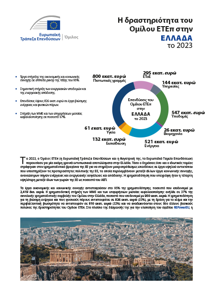 Το 2023, ο Όμιλος ΕΤΕπ (η Ευρωπαϊκή Τράπεζα Επενδύσεων και η θυγατρική της, το Ευρωπαϊκό Ταμείο Επενδύσεων) παρουσίασε για μία ακόμη χρονιά εντυπωσιακά αποτελέσματα στην Ελλάδα. Τόσο ο δημόσιος όσο και ο ιδιωτικός τομέας στράφηκαν στον χρηματοδοτικό βραχίονα της ΕΕ για να στηρίξουν μακροπρόθεσμες επενδύσεις σε έργα υψηλού αντικτύπου που υποστηρίζουν τις προτεραιότητες πολιτικής της ΕΕ, τα οποία περιλαμβάνουν μεταξύ άλλων έργα κοινωνικής συνοχής, ανανεώσιμων πηγών ενέργειας και ενεργειακής ασφάλειας και απόδοσης. Η χρηματοδότηση που υπεγράφη ήταν η τέταρτη υψηλότερη μεταξύ όλων των χωρών της ΕΕ ως ποσοστό του ΑΕΠ.
