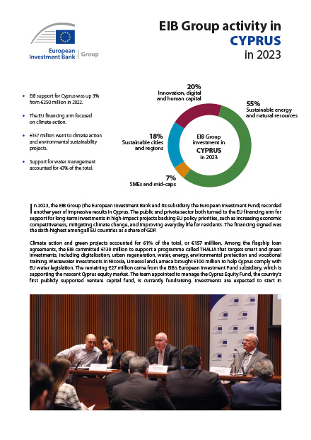 In 2023, the EIB Group (the European Investment Bank and its subsidiary the European Investment Fund) recorded another year of impressive results in Cyprus. The public and private sector both turned to the EU financing arm for support for long-term investments in high-impact projects backing EU policy priorities, such as increasing economic competitiveness, mitigating climate change, and improving everyday life for residents. The financing signed was the sixth-highest among all EU countries as a share of GDP.