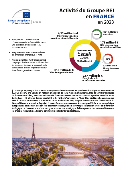 Le Groupe BEI a connu une activité en nette augmentation de 16 % l’an dernier en France. Près de 12 milliards d’euros de financements à long terme ont été accordés directement ou indirectement au secteur privé et aux collectivités territoriales : 10,6 milliards d’euros pour la BEI et 1,4 milliard d’euros pour le FEI, sa filiale dédiée au financement des PME. À l’échelle européenne, la France s’est située au deuxième rang des pays bénéficiaires des financements du Groupe BEI avec une centaine de projets financés. Dans un environnement économique difficile, la banque publique européenne a pleinement joué son rôle de soutien contracyclique à l’activité par ses prêts en faveur de la transition écologique, de l’innovation et d’une plus grande autonomie stratégique de l’Europe dans des secteurs clés comme les énergies renouvelables, les semi-conducteurs ou les batteries électriques.