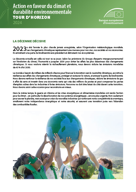 Cette publication propose un tour d’horizon de la contribution de la Banque européenne d’investissement à l’action en faveur du climat et à la durabilité environnementale. Elle précise les activités de la Banque dans ce secteur et met en avant des projets phares. Les récits, les vidéos et les études de cas illustrent comment les financements et conseils de la Banque aident les pays, les régions et les villes.