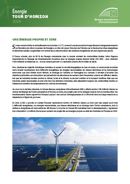 Cette publication propose un tour d’horizon du travail de la Banque européenne d’investissement dans le domaine de l'énergie. Elle précise les activités de la Banque dans ce secteur et met en avant des projets phares. Les récits, les vidéos et les études de cas illustrent comment les financements et conseils de la Banque aident les pays, les régions et les villes.