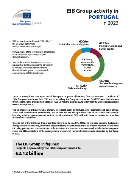 In 2023, Portugal was once again one of the top ten recipients of financing from the EIB Group — made up of the European Investment Bank (EIB) and its subsidiary, the European Investment Fund (EIF) — in the European Union, in terms of its gross domestic product (GDP). Financing totalling €2.12 billion from the EIB Group represented 0.8% of Portugal's GDP.