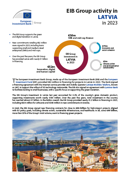 The European Investment Bank Group, made up of the European Investment Bank (EIB) and the European Investment Fund (EIF), provided €82 million in financing for projects in Latvia in 2023. The Bank signed a financing agreement with the internet service provider and mobile operator Latvijas Mobilais Telefons, known as LMT, to support the rollout of 5G technology nationwide. The EIB also signed an agreement with Luminor Bank to facilitate lending to small businesses, with a specific focus on supporting the green transition.