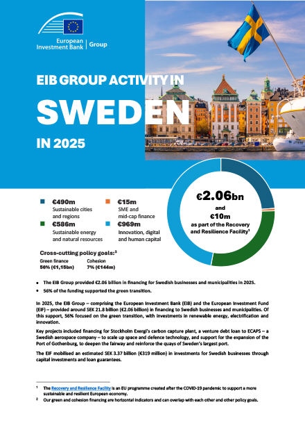 In 2025, the EIB Group – comprising the European Investment Bank (EIB) and the European Investment Fund (EIF) – provided around SEK 21.8 billion (€2.06 billion) in financing to Swedish businesses and municipalities. Of this support, 56% focused on the green transition, with investments in renewable energy, electrification and innovation.