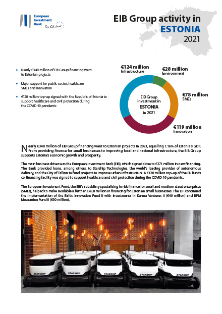 Despite the continuing impact of the pandemic, the EIB Group, consisting of the European Investment Bank (EIB) and the European Investment Fund (EIF), obtained a good result in Estonia 2021 again. Overall, some €348 million worth of investments between the European Investment Bank and its subsidiary the European Investment Fund benefitted companies and public institutions in the country. Major support went for public sector, healthcare, SMEs and innovation. A €120 million top-up of the EU funds co-financing facility was signed to support healthcare and civil protection during the COVID-19 pandemic.